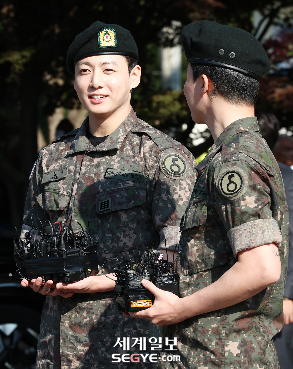 그룹 방탄소년단 정국(사진 왼쪽)과 지민이 11일 오전 경기 연천군 연천읍 연천공설운동장에서 진행된 전역 행사에 참석해 취재진의 질문에 답하고 있다.