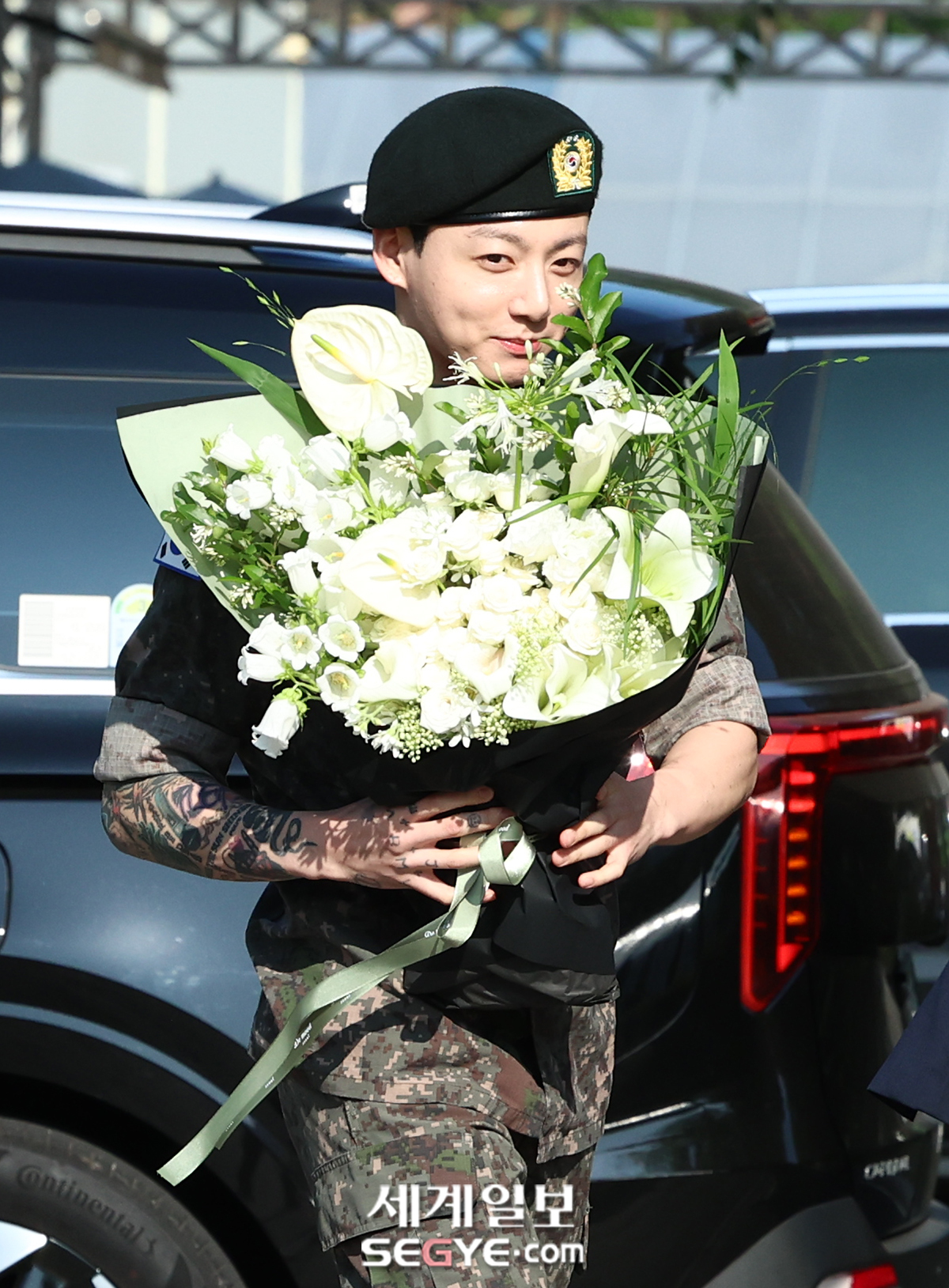그룹 방탄소년단 정국이 11일 오전 경기 연천군 연천읍 연천공설운동장에서 진행된 전역 행사에 참석하고 있다.