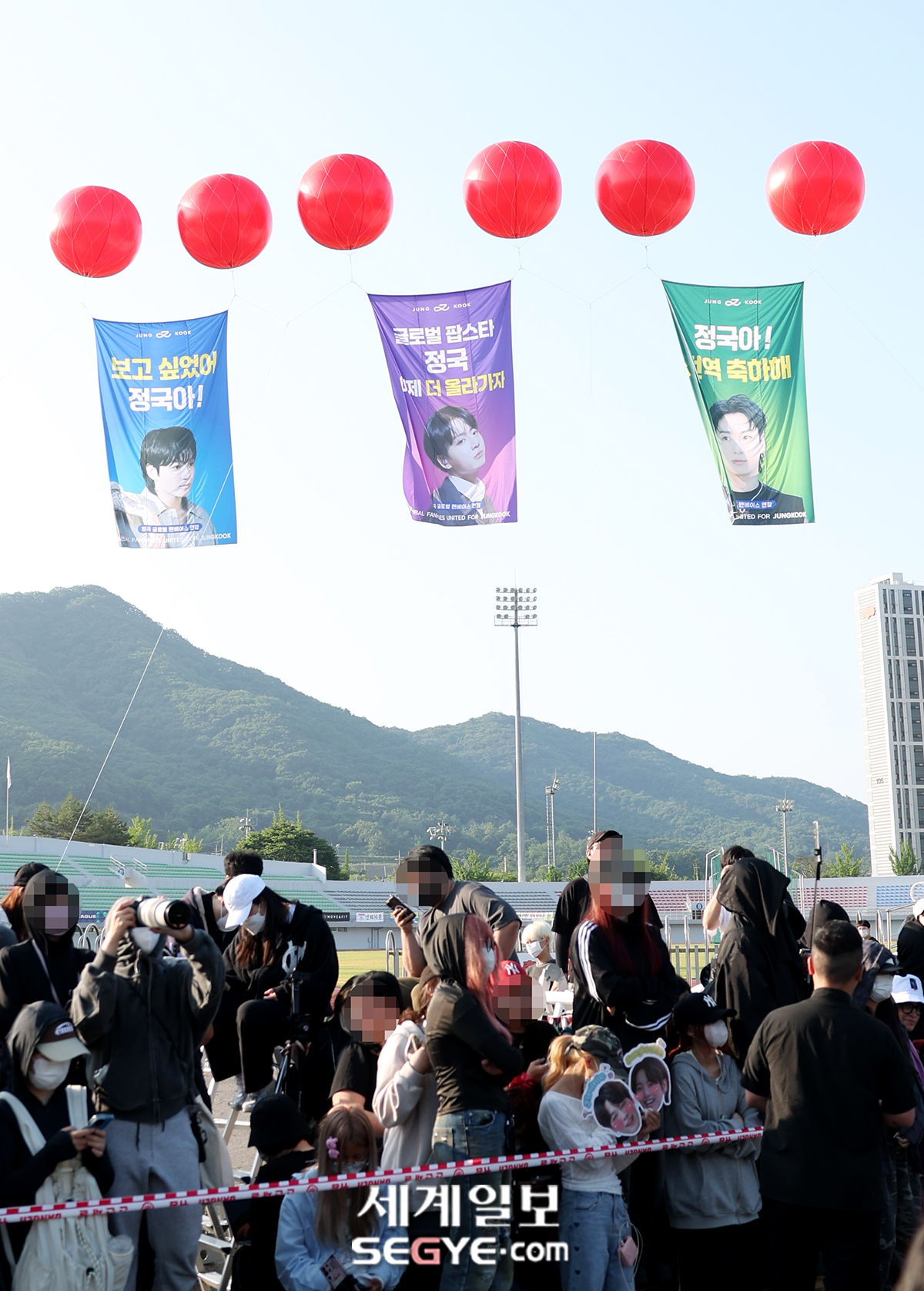 그룹 방탄소년단 정국과 지민이 11일 오전 경기 연천군 연천읍 연천공설운동장에서 진행된 전역 행사에 참석한 가운데 팬들이 준비한 축하 애드벌룬이 설치돼 있다.