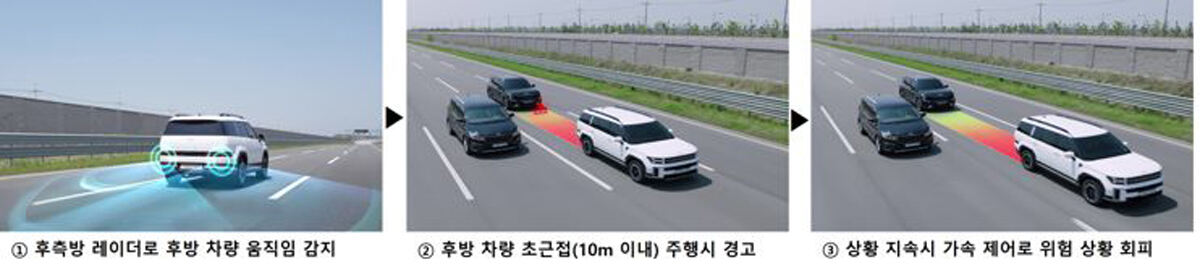현대모비스가 11일 고속도로에서 뒤 차량이 근접 주행을 할 경우 차량이 스스로 안전 거리를 확보하는 후방 안전 제어 기술을 개발했다고 밝혔다. 차량의 후측방 레이더와 전방 카메라 등 센서와 주행 제어 기술을 연동한 신기술이다.