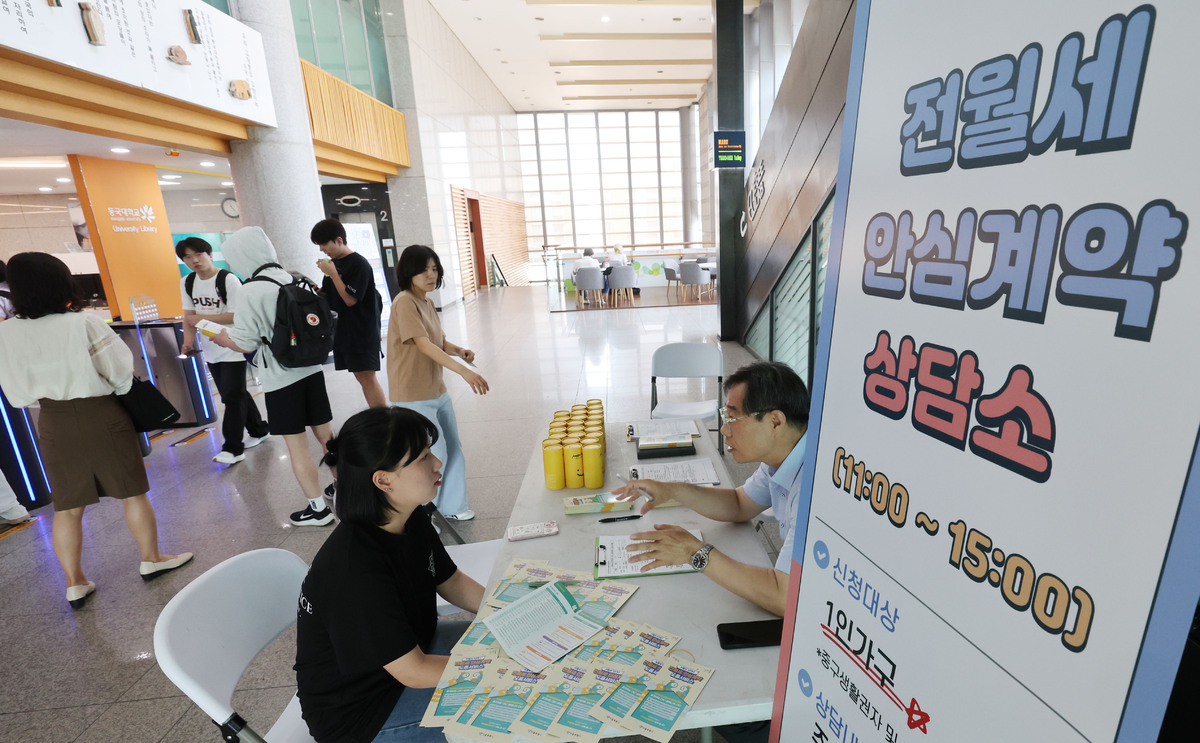 11일 서울 중구 동국대 중앙도서관 입구에서 중구청 주최로 ‘찾아가는 전월세 안심계약 상담소’가 운영되고 있다. 중구는 부동산 계약에 어려움을 겪는 대학생 1인 가구를 돕고자 행사를 열었다.