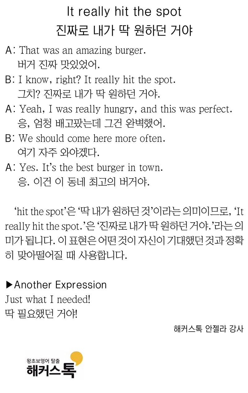 [해커스톡 일대일 영어회화] 하루 1분 기초 영어회화 말하기 (6월 13일) 입력 : 2025-06-13 09:00:00 수정 : 2025-06-12 18:37:43 구글 네이버 유튜브 It really hit the spot 진짜로 내가 딱 원하던 거야 Copyright ⓒ 세계일보. 무단 전재 및 재배포 금지 세계일보