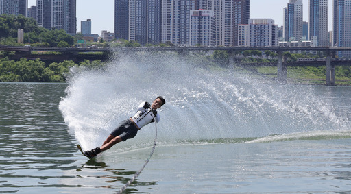 서울의 낮 최고기온이 32도까지 오른 12일 뚝섬한강공원을 찾은 한 수상스키 동호인이 한강 물살을 가르며 더위를 식히고 있다. 제주에서는 이날부터 장마가 시작됐고 14일 전국적으로 비가 확산하겠다.