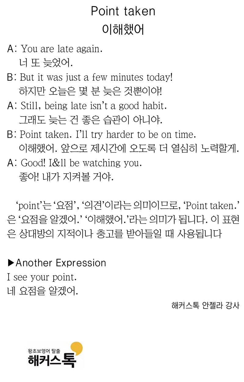 [해커스톡 일대일 영어회화] 하루 1분 기초 영어회화 말하기 (6월 16일) 입력 : 2025-06-16 09:00:00 수정 : 2025-06-15 18:13:51 구글 네이버 유튜브 Point taken 이해했어 Copyright ⓒ 세계일보. 무단 전재 및 재배포 금지 세계일보