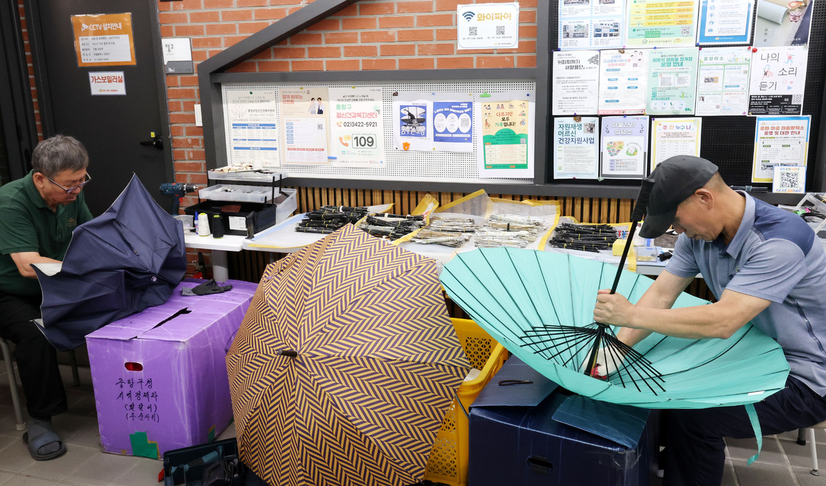 16일 서울 중랑구 망우동 망우마중마을활력소에서 우산수리 기술자들이 고장 난 우산을 수리하고 있다. 중랑구는 지역공동체 일자리 창출과 생활밀착형 행정서비스 제공을 위해 10월까지 ‘2025 찾아가는 칼갈이·우산수리 서비스’를 운영한다.