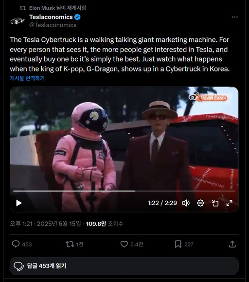 일론 머스크 테슬라 최고경영자(CEO)가 가수 지드래곤이 테슬라 사이버트럭에 탄 영상을 리트윗했다.