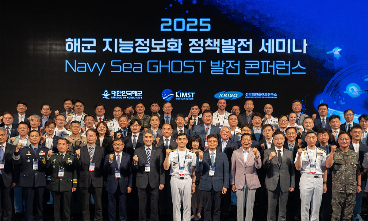 17일 서울 용산 드래곤시티호텔에서 개최된 ‘2025 해군 지능정보화 정책발전세미나 및 네이비 시 고스트(해군의 유무인 복합 전투체계) 발전 콘퍼러스’에서 양용모 해군참모총장(앞줄 가운데) 등 주요 참가자들이 기념 촬영을 하고 있다. 양 총장은 “인공지능(AI)은 전장의 모든 분야에서 활용되며 가장 강력한 게임체인저로 부상했다”며 “미래에는 유·무인 전력을 통합한 MUM-T(유·무인 복합체계) 캐리어(항모)를 기반으로 해양 전투단을 구성하는 꿈을 갖고 있다”고 강조했다.
