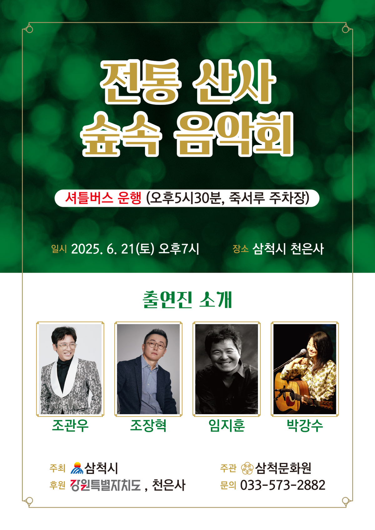 삼척시는 오는 21일 지역 문화유산과 자연이 어우러지는 특별한 무대 ‘전통 산사 숲속 음악회’를 개최한다고 18일 밝혔다.