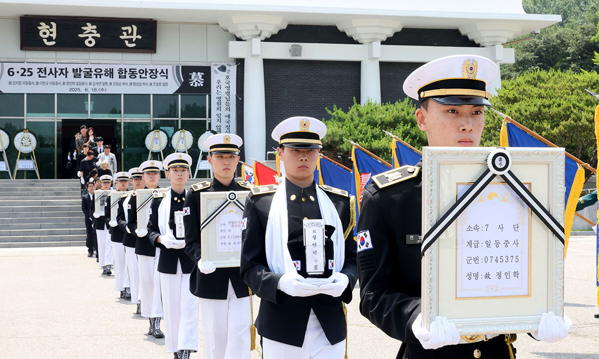 6·25 전사자 발굴 유해 합동 안장식 입력 : 2025-06-18 23:15:00 수정 : 2025-06-18 18:50:33 이제원 선임기자 구글 네이버 유튜브 6·25 전사자 발굴 유해 합동 안장식 6·25전쟁 75주년을 일주일 앞둔 18일 서울 동작구 국립서울현충원에서 6·25전쟁 전사자 발굴 유해 합동 안장식이 열려 호국영웅 7위의 영정과 영현이 봉송되고 있다. 2000년 시작된 유해 발굴 사업으로 1만1394명의 국군 전사자가 발굴됐다. 이제원 기자 Copyright ⓒ 세계일보. 무단 전재 및 재배포 금지 세계일보 이제원