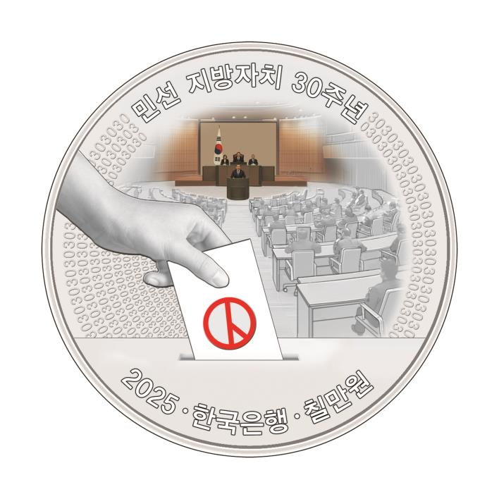 한국은행이 1995년 제1회 전국동시지방선거 실시 30주년을 맞아 기념주화 2종을 발행한다고 19일 밝혔다. 지방의회와 지방선거 투표 장면이 담긴 도안(사진), 우리나라 전국 지도와 17개 광역지방자치단체의 세부 지도를 함께 배치한 두 가지 도안이 있다. 액면가는 7만원으로 한국조폐공사와 우리·농협은행에서 7월14일부터 8월1일까지 예약을 받아 8월 말 교부한다.