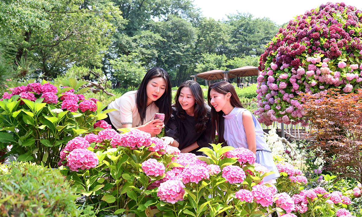 19일 서울 노원구 초안산 수국동산을 찾은 시민들이 활짝 핀 수국을 감상하고 있다. 지난해 4월 문을 연 초안산 수국동산에는 목수국, 아나벨, 썸머시리즈 등 17종 1만여본의 수국이 시차를 두고 개화한다. 노원구는 다음달 6일까지 수국 원예전시와 야간 조명을 운영한다.