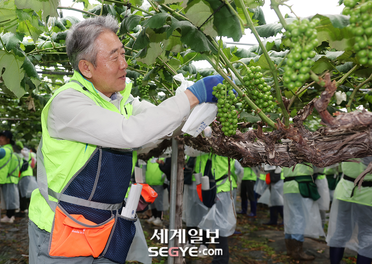 강호동 농협중앙회장이 20일 경기도 화성시 송산면 포도 농가에서 진행된 '범농협 한마음 농촌일손 지원의 날' 행사에 참석해 포도 봉지씌우기 봉사활동을 하고 있다.