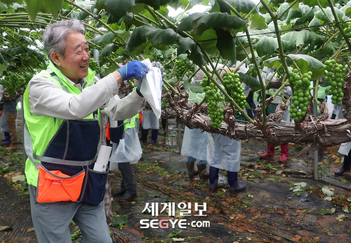 강호동 농협중앙회장이 20일 경기도 화성시 송산면 포도 농가에서 진행된 '범농협 한마음 농촌일손 지원의 날' 행사에 참석해 포도 봉지씌우기 봉사활동을 하고 있다.
