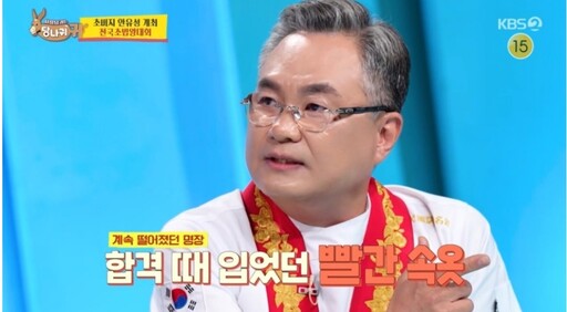 스튜디오에서 이를 지켜보던 출연진이 경악하자 안 셰프는 "부적 같은 거다. 명장 심사에 계속 떨어졌는데 저걸 입고 합격했다"며 "'흑백요리사' 때 저걸 안 입어서 떨어졌다"고 주장했다.
