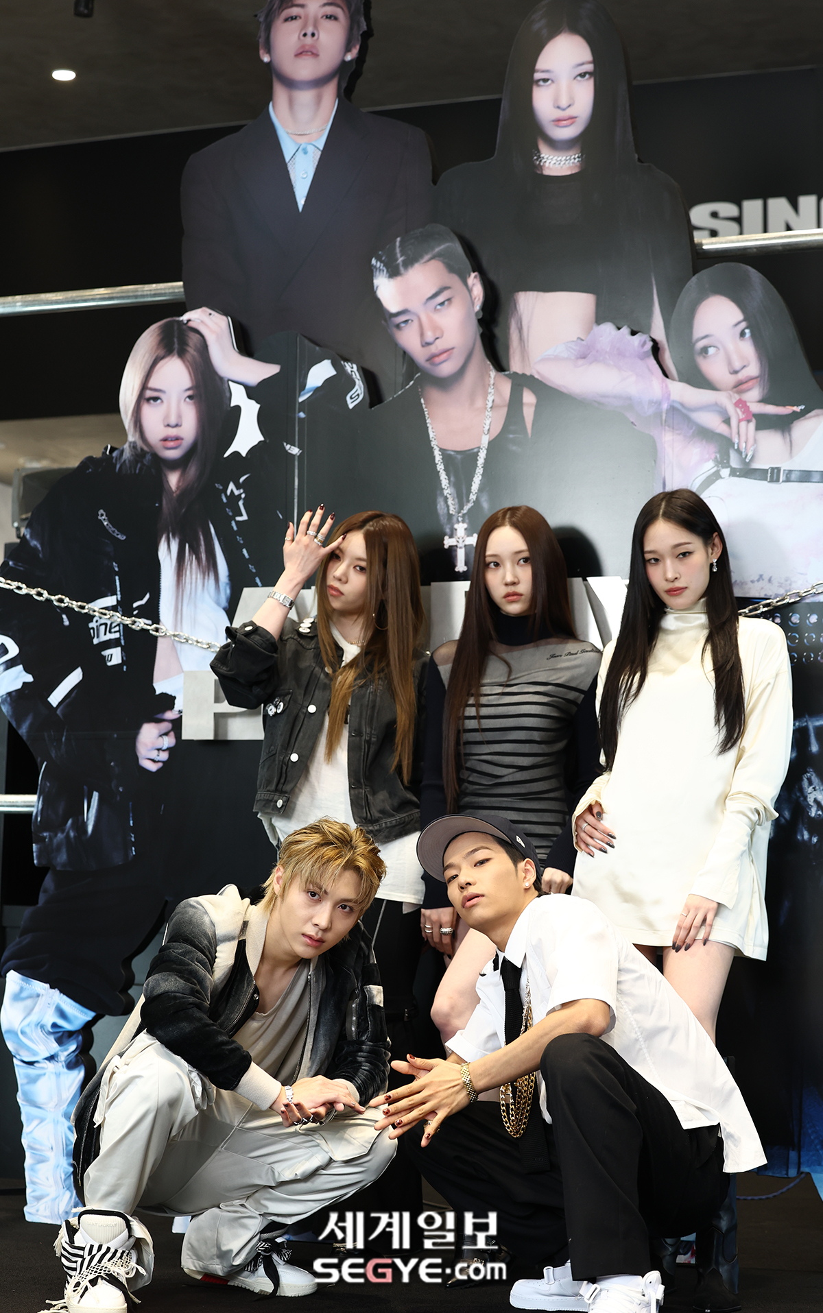 그룹 올데이프로젝트(ALLDAY PROJECT)가 23일 오후 서울 강남구 일상비일상의틈byU+에서 열린 ‘올데이 프로젝트’ 싱글 ‘페이머스’(FAMOUS) 발매 기념 팝업 스토어 행사에 참석해 포즈를 취하고 있다.