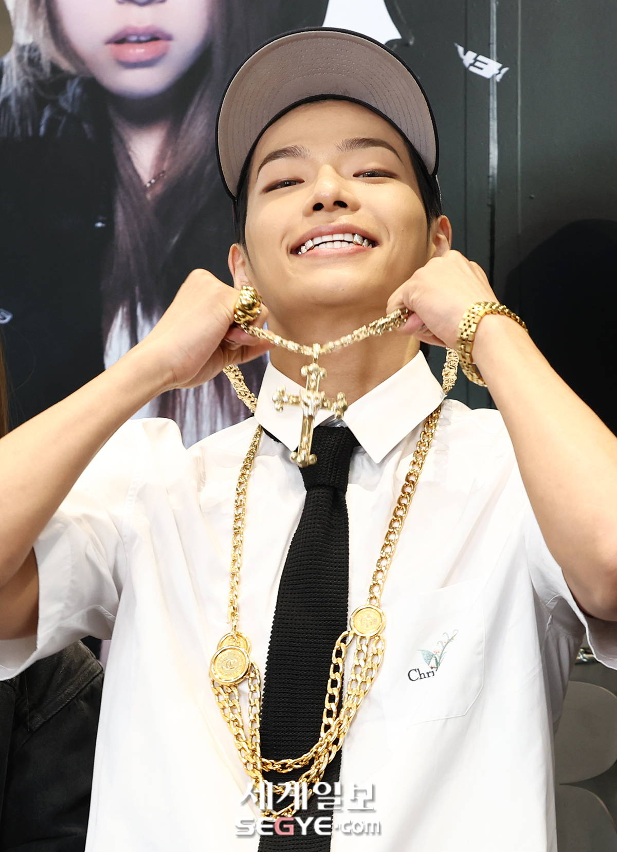 그룹 올데이 프로젝트(ALLDAY PROJECT) 타잔이 23일 오후 서울 강남구 일상비일상의틈byU+에서 열린 ‘올데이 프로젝트’ 싱글 ‘페이머스’(FAMOUS) 발매 기념 팝업 스토어 행사에 참석해 포즈를 취하고 있다.