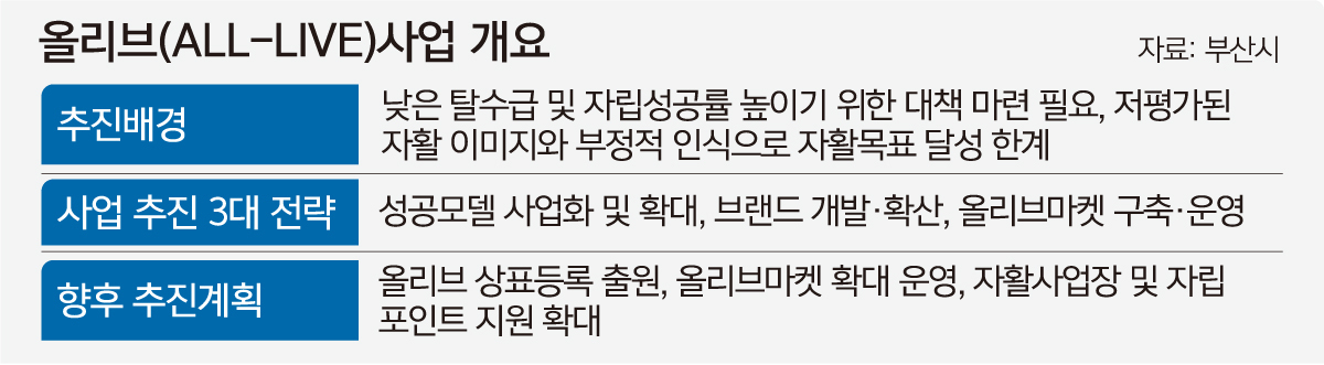 부산시는 23일 시청 대강당에서 부산 자활 혁신 프로젝트 ‘올리브(ALL-LIVE)사업’을 론칭했다고 밝혔다. 부산형 자활 혁신 프로젝트는 민관이 함께 자활 정책의 새로운 전환점을 마련한다는 점에서 의미가 크다. 올리브 사업은 자활 체계(패러다임)를 전환하는 사업으로 공공복지 돌봄서비스 성공모델 사업화·확대, 자활브랜드(ALL-LIVE) 개발·확산, 올리브마켓 구축·운영 3대 핵심 전략을 중심으로 본격 추진된다.