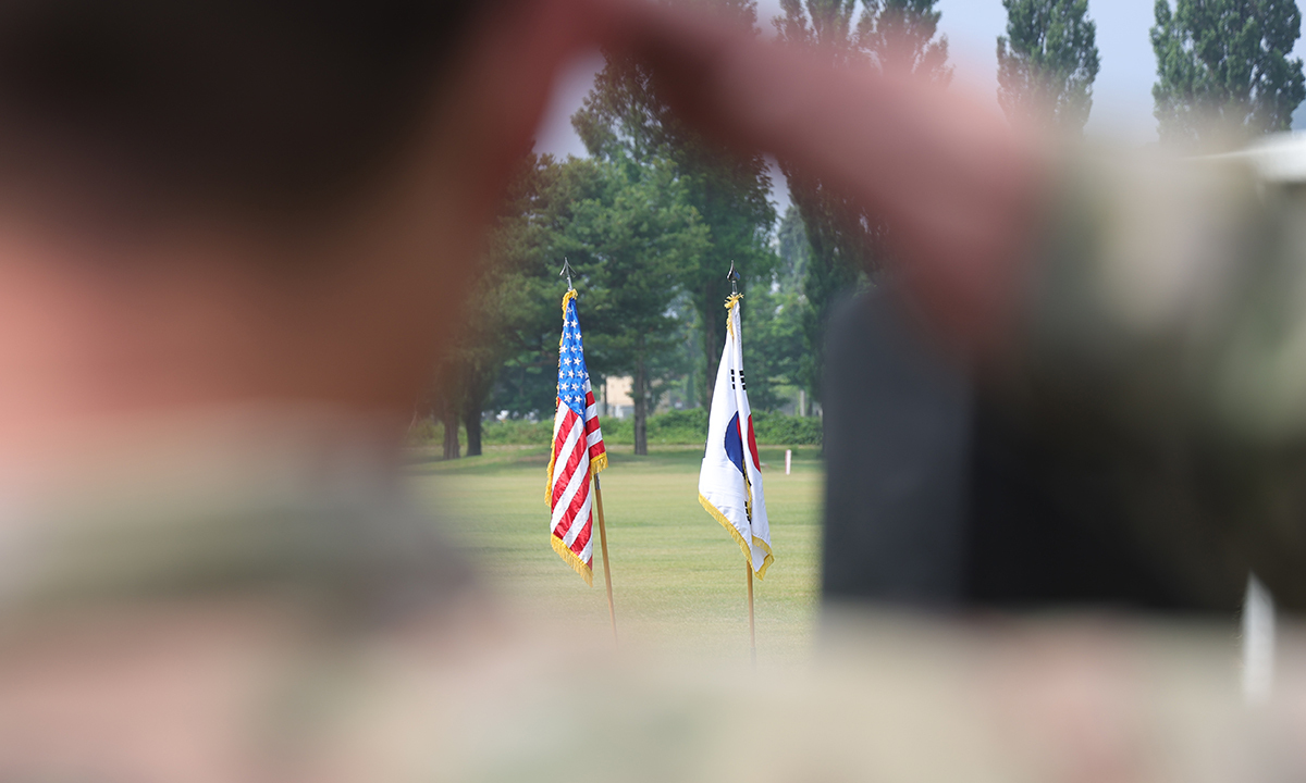 지난 18일 경기도 동두천시 캠프 케이시에서 열린 주한미군 순환배치 여단 임무교대식에서 주한미군 장병이 태극기와 성조기를 향해 경례하고 있다. 연합뉴스