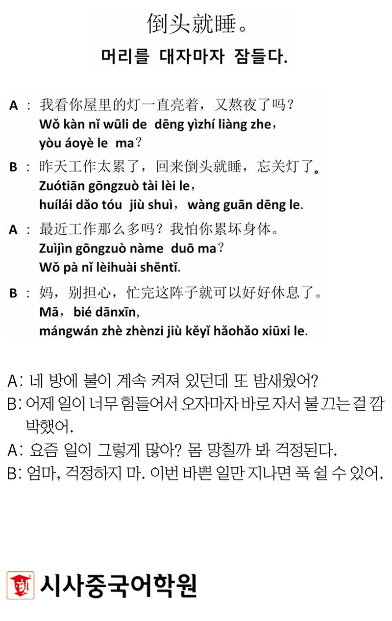 [시사중국어학원의 리얼 중국어 회화] 머리를 대자마자 잠들다. 입력 : 2025-06-23 18:21:31 수정 : 2025-06-23 18:21:30 구글 네이버 유튜브 Copyright ⓒ 세계일보. 무단 전재 및 재배포 금지 세계일보