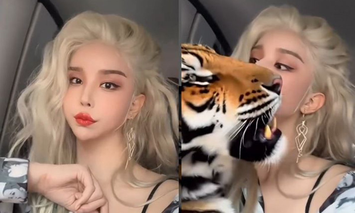 이어 호랑이가 그녀의 얼굴에 다가와 코를 비비는 듯한 장면이 연출돼 눈길을 끌었다. 이 호랑이는 모바일 애플리케이션의 특수효과를 활용한 것으로 추정된다.
