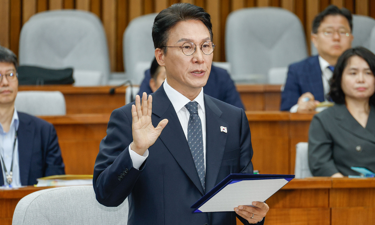 김민석 국무총리 후보자가 24일 서울 여의도 국회에서 열린 국무총리 임명동의안 심사를 위한 인사청문회에서 선서를 하고 있다.