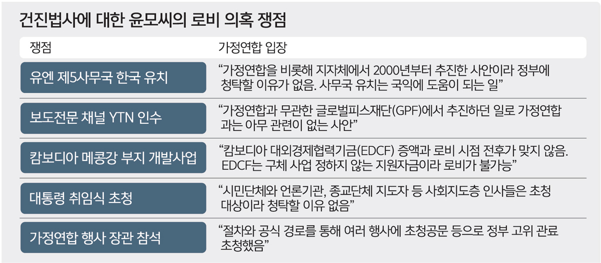 더군다나 메콩강 개발사업은 지역 발전과 주민 생활 개선을 위해 캄보디아 정부가 추진한 숙원사업이자 시진핑 중국 국가주석의 일대일로 정책과 맞닿아 있다. 가정연합 측은 “윤씨가 2023년 연합을 떠난 이후 모 건설사 전직 사장과 여러 차례 캄보디아를 방문했다는 보도가 있었는데 연합에는 이와 관련한 어떤 실무 조직이나 예산 집행 체계도 존재하지 않는다”고 밝혔다. 가정연합 관계자는 “아프리카 새마을운동 관련한 로비도 얘기하는데 상식적으로 그럴 필요가 있겠느냐”고 되물었다.