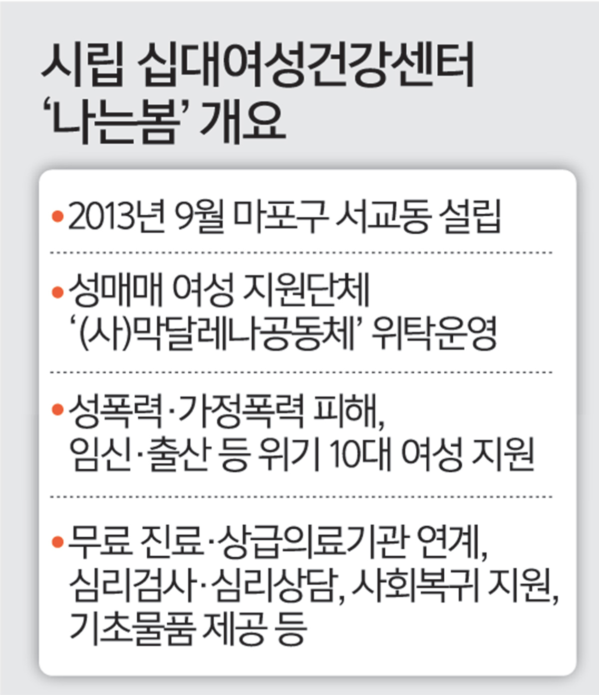 서울시가 10대 여성 건강·의료 지원기관인 ‘서울시립 십대여성건강센터 나는봄’ 폐쇄 및 신규통합센터 설치 입장을 공식화했다. 십대여성건강센터는 가출·성매매 등으로 위기에 몰린 10대 여성 청소년의 건강·의료지원을 위한 기관이다. 센터 종사자와 시민단체 등은 2021년 오세훈 시장 복귀 이후 서울시사회서비스원 등 서울시의 사회복지시설이 연이어 문을 닫고 있다며 “공공복지 축소 움직임”이라고 반발하고 있다.