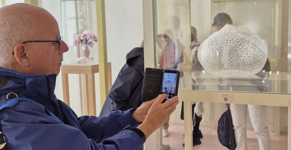 지난해 이탈리아 베네치아에서 열린 ‘호모파베르’ 전시회에서 관람객이 고혜정 작가의 작품을  카메라에 담고 있다. 청주공예비엔날레 조직위원회 제공