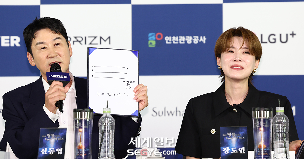배우 신동엽(사진 왼쪽)과 장도연이 25일 서울 여의도CGV에서 열린 제4회 청룡시리즈어워즈 핸드프린팅 행사에 참석해 대화를 나누고 있다.