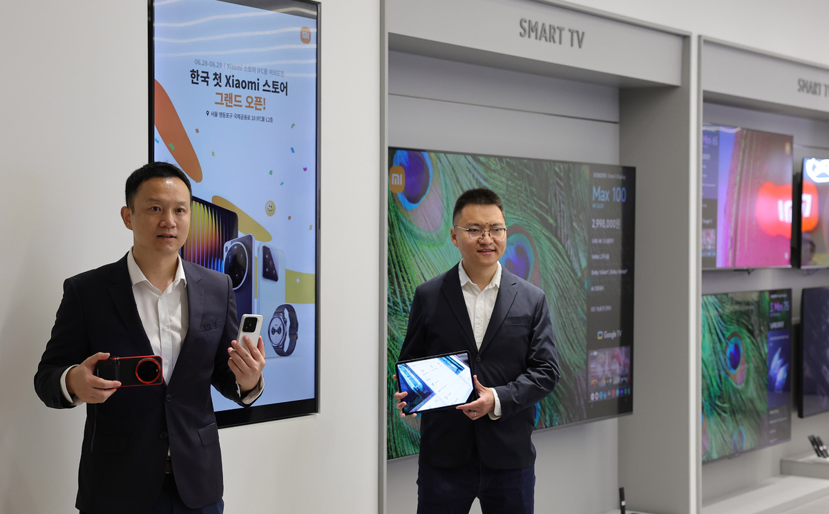 앤드류 리 샤오미 동아시아 총괄(오른쪽)과 조니 우 샤오미코리아 사장이 25일 서울 여의도 샤오미 스토어 서울 IFC몰 여의도점에서 열린 첫 공식 오프라인 매장 오픈 기념행사에서 제품을 소개하고 있다.
