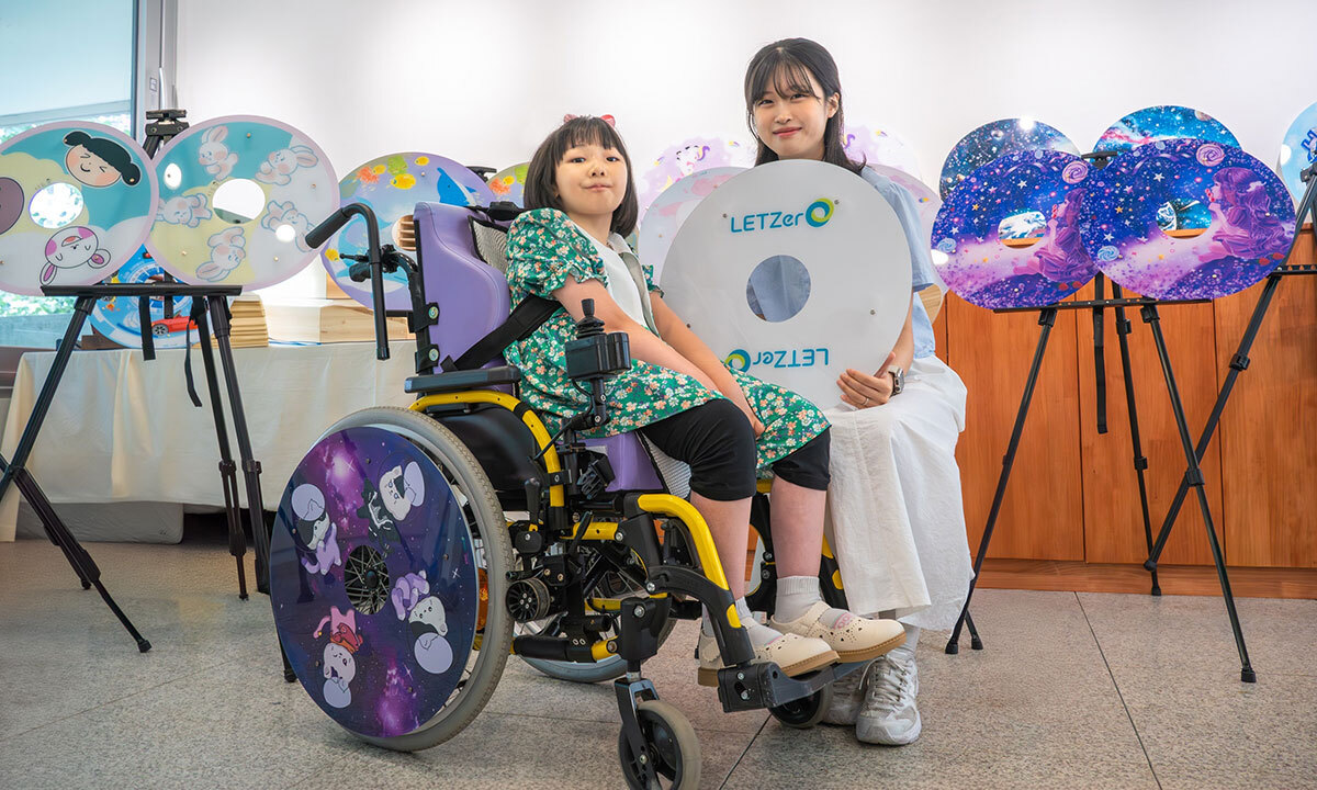 LG화학 COC랩 스포크 가드를 디자이너와 꾸며 휠체어에 부착한 어린이 모습. LG화학 제공