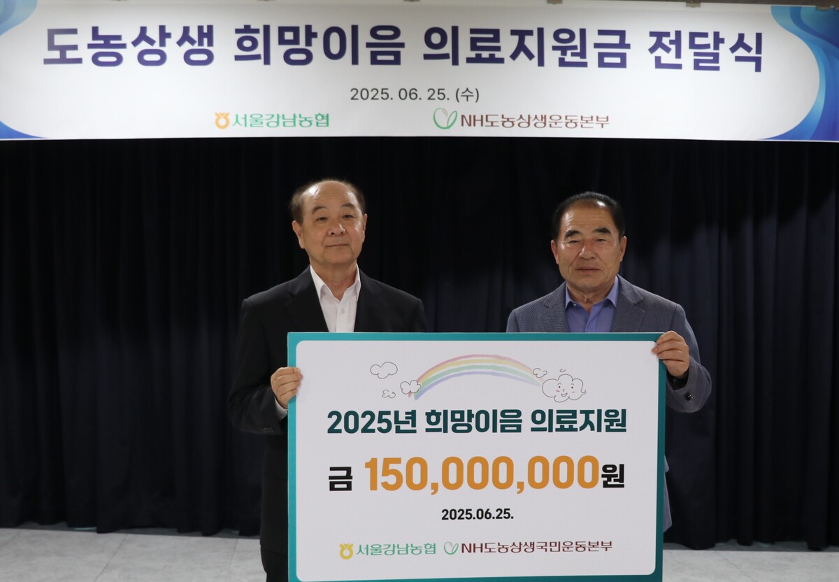 농협중앙회(회장 강호동) 산하 공익법인인 도농상생국민운동본부(대표 장문찬)는 6월 25일, 강남농협(조합장 이종호)과 함께 강남농협 내곡지점에서 ’2025년 희망이음 의료지원금 전달식’을 개최했다.