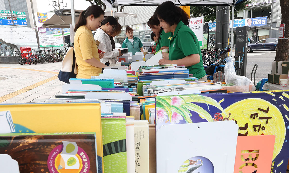 25일 서울 광진구 군자역 5번 출구 앞에서 열린 ‘2025 광진구민 알뜰도서 무료 교환시장’에서 주민들이 교환할 책을 살펴보고 있다. 27일까지 3일간 이어지는 알뜰도서 무료 교환시장에는 기증 등으로 마련된 1500여권의 책이 준비되어 있고 1인당 최대 3권까지 교환할 수 있다.