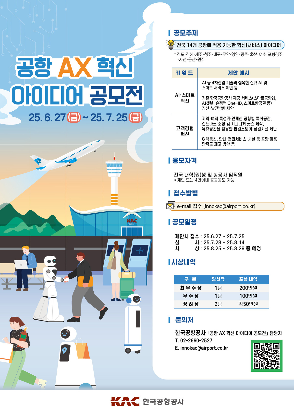 한국공항공사는 27일부터 한 달간 대학(원)생과 항공사 임직원을 대상으로 ‘공항 AX(Ai + Transformation) 혁신 아이디어 공모전’을 개최한다고 26일 밝혔다.