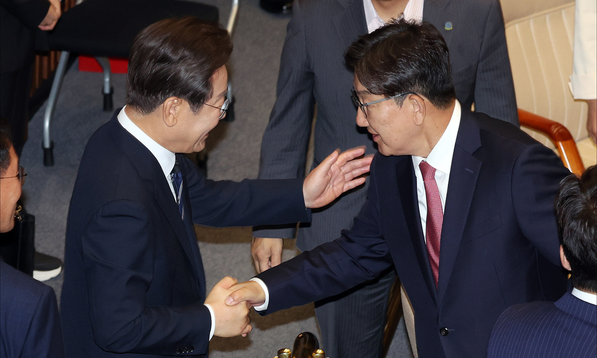이 대통령은 추경의 조속한 통과를 위한 여야의 협조를 당부하면서 “국민의힘 의원님들 어려운 자리 함께해주신 점 대해 진심으로 감사하게 생각한다. 고맙다”라는 말로 시정연설을 마쳤다. 연설을 마친 후 퇴장하면서도 이 대통령은 국민의힘 의원들이 앉은 곳으로 가장 먼저 향했다. 이 대통령은 국민의힘 의원들과 한 명 한 명 악수하며 인사를 나눴다. 이 대통령과 대학 동문이자 지난 정권에서 이른바 ‘친윤(친윤석열) 핵심’으로 여겨지던 국민의힘 권성동 의원과는 손을 맞잡은 채 잠시간 대화를 나눴고, 이 대통령이 웃으며 권 의원의 팔을 가볍게 한 차례 치는 모습을 보이기도 했다.