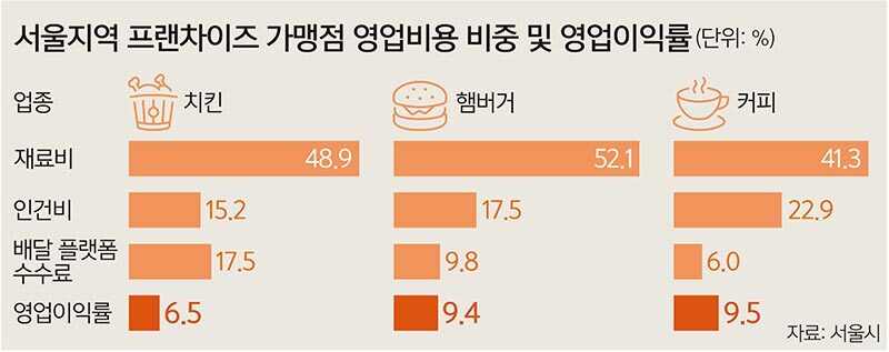 플랫폼 수수료 부담이 높을수록 영업이익률은 낮았다. 가맹점들의 평균 영업이익률은 8.7%로 나타났으며 커피(9.5%), 햄버거(9.4%), 치킨(6.5%) 업종 순으로 확인됐다. 시는 “점주 인건비를 제외한 기준으로 분석된 것이므로 실제 체감 수익은 이보다 더 낮을 수 있다”고 부연했다.