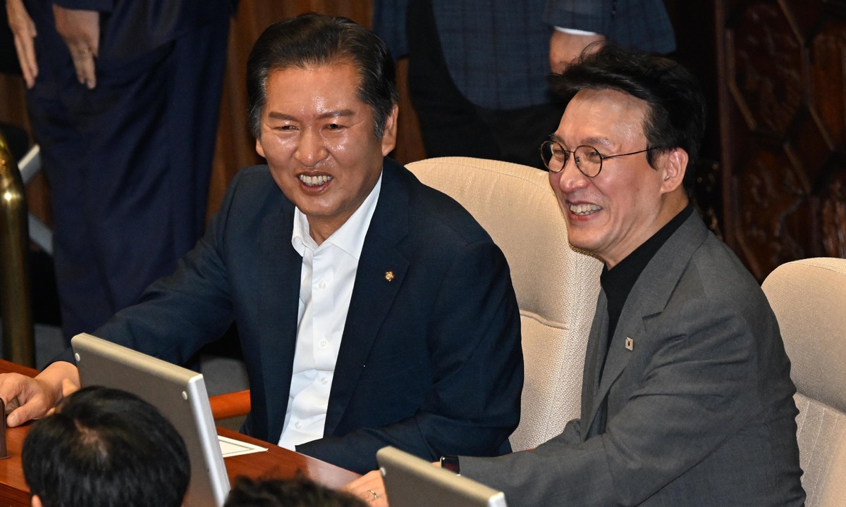 김민석 국무총리 후보자가 26일 국회 본회의장에서 정청래 더불어민주당 의원과 대화하고 있다. 뉴스1