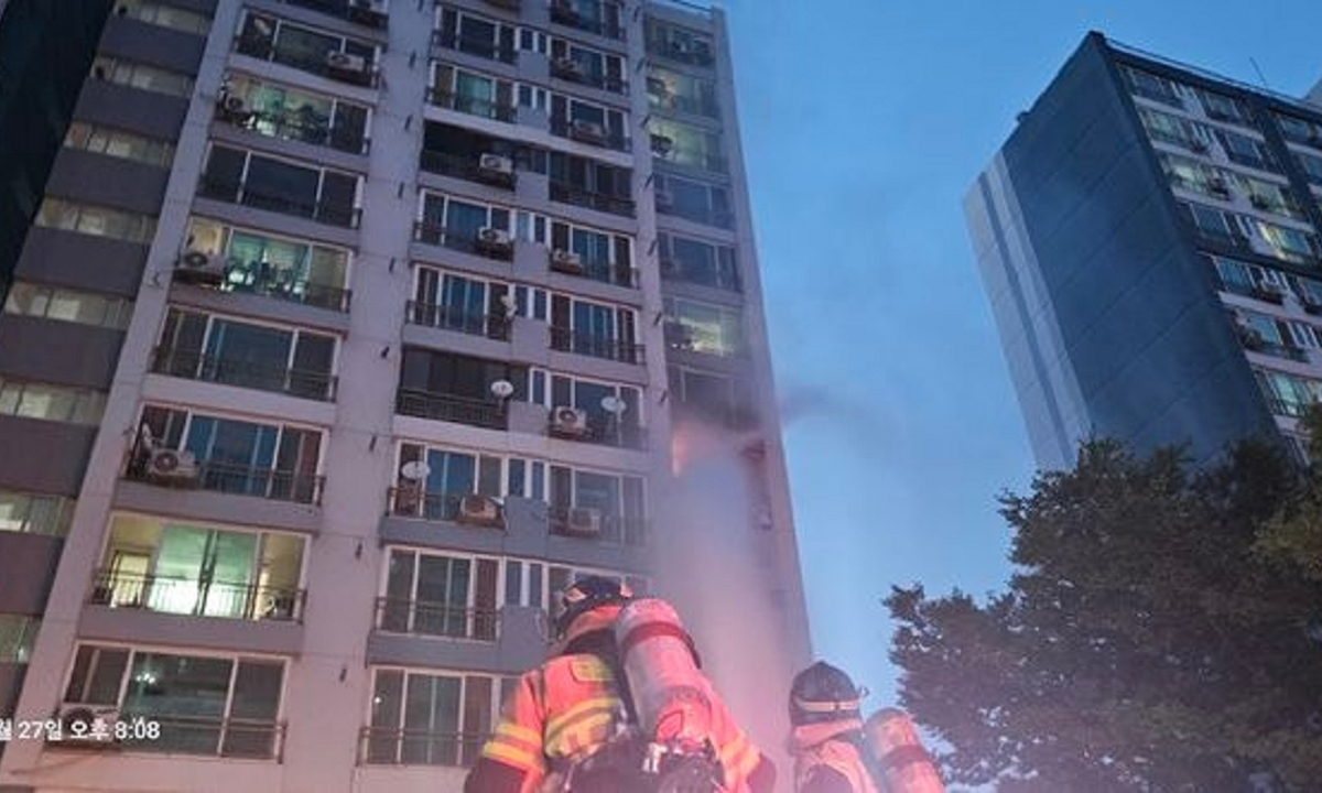A씨는 불길을 피하기 위해 아파트 베란다 난간에 매달려 있었다. 현장에 출동한 소방당국이 안전 조치를 취했다. 불은 14분 만에 진화됐다.