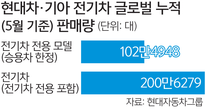 29일 현대차와 기아 IR(기업설명)에 따르면 지난달 기준 현대차그룹 전기차 전용 모델(승용차 한정)의 글로벌 누적 판매량은 102만4948대를 기록했다. 100만대 돌파는 2021년 2월 현대차의 첫 전용 전기차 아이오닉5 출시 이후 4년4개월 만이다. 전용 전기차를 포함한 전기차 누적 판매량도 200만6279대로, 2011년 현대차그룹의 첫 전기차인 블루온이 선보인 후 15년 만에 200만대를 넘겼다.