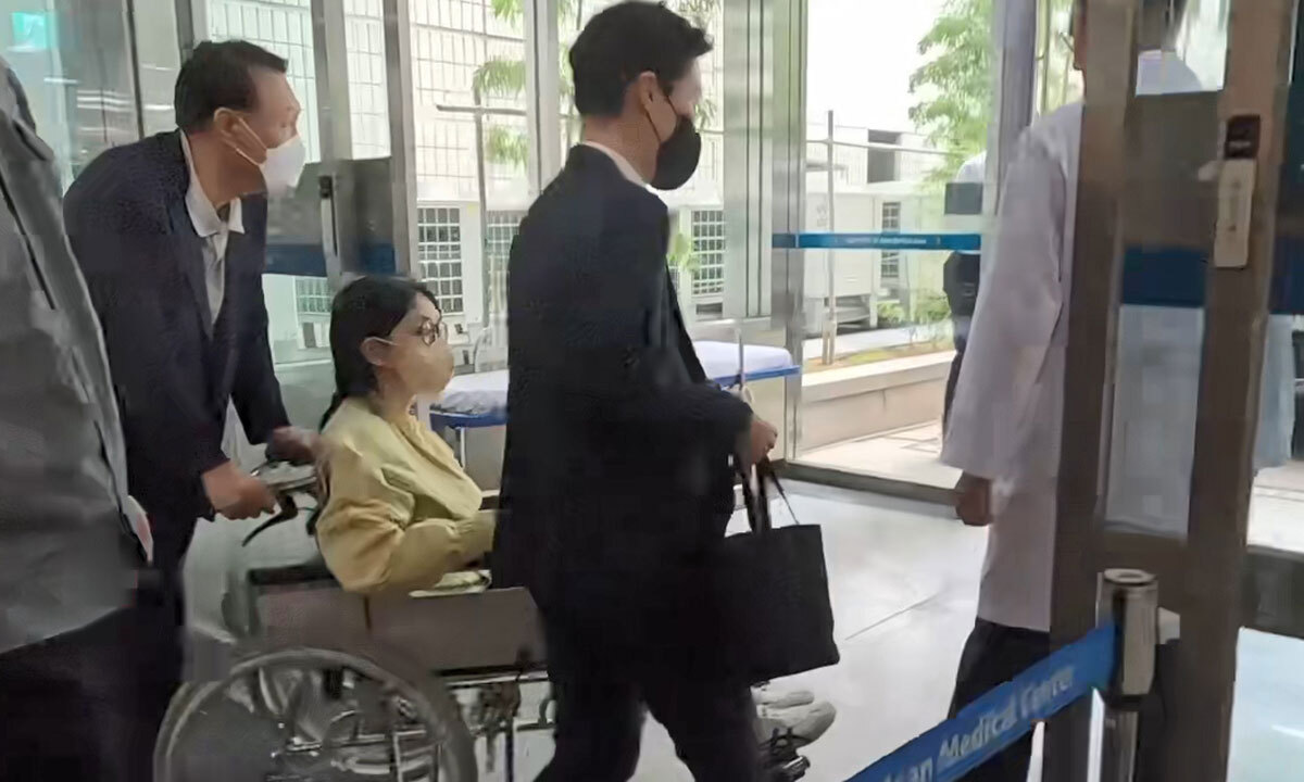 휠체어 타고 윤석열 전 대통령의 부인 김건희씨가 27일 서울아산병원에서 윤 전 대통령이 미는 휠체어를 타고 병원 문을 나서고 있다. 연합뉴스