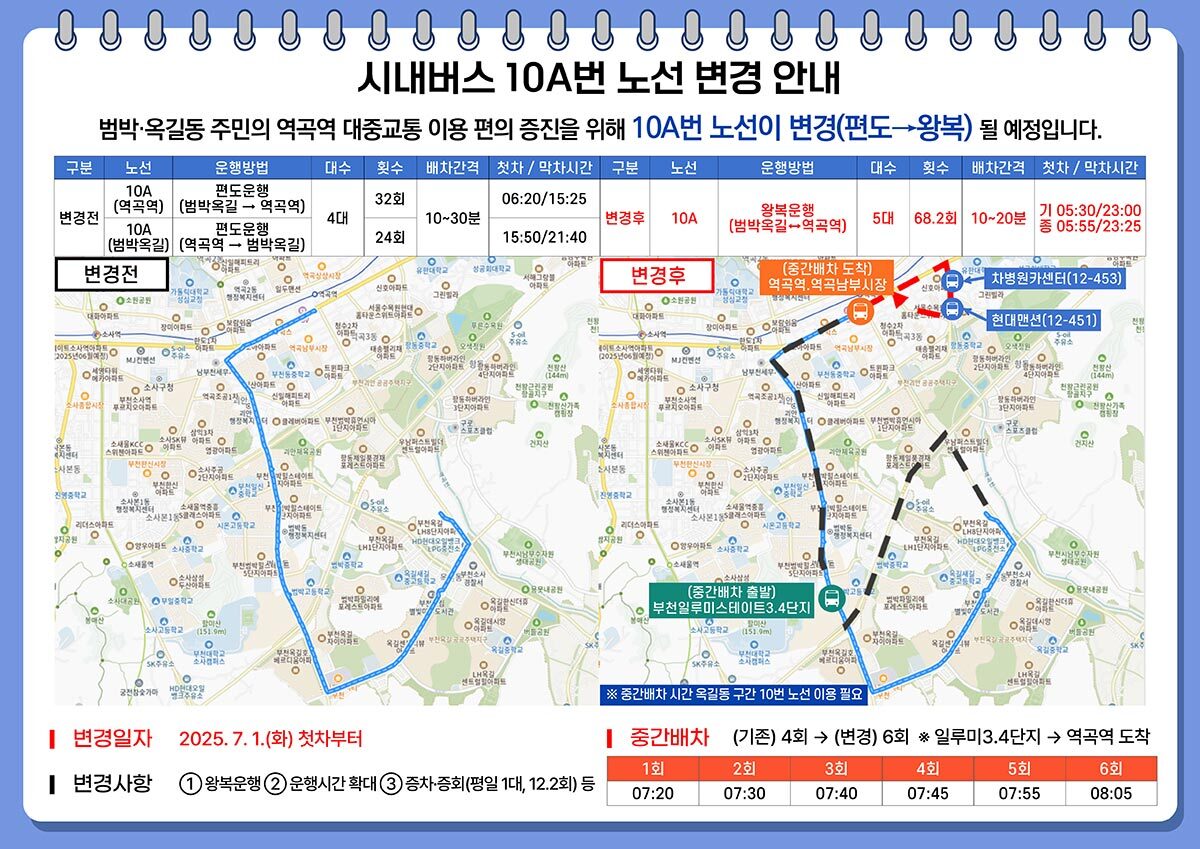 경기 부천시가 관내 범박·옥길동 지역에서 역곡역으로 접근성 개선을 추진한다. 부천시는 다음달 1일부터 10A번 노선을 ‘시내버스 공공관리제’로 전환해 운영한다고 30일 밝혔다.