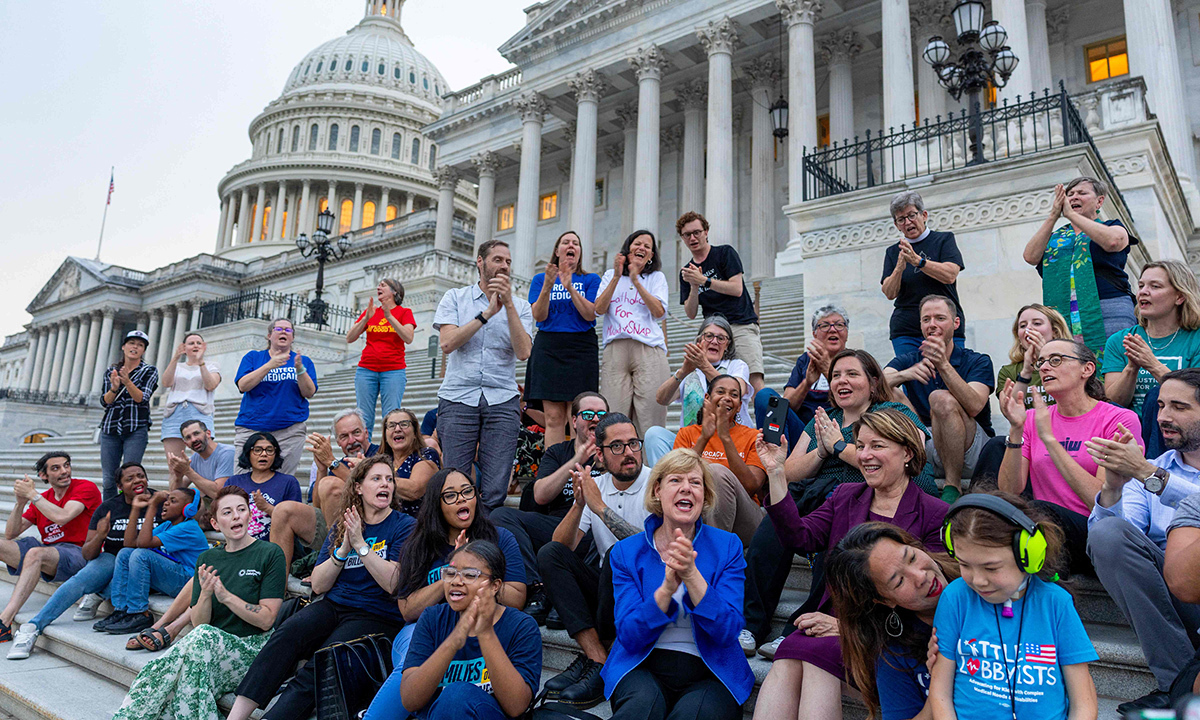 “감세안 저지할 것” 다짐하는 민주 의원들 29일(현지시간) 도널드 트럼프 미국 대통령의 감세안에 직접적 타격을 입을 것으로 우려되는 저소득층과 장애인 등이 모인 워싱턴 의회의사당 앞에서 에이미 클로버샤(앞줄 오른쪽 다섯 번째) 등 민주당 상원의원들이 법안 저지를 다짐하며 박수를 치고 있다. 워싱턴=AFP연합뉴스
