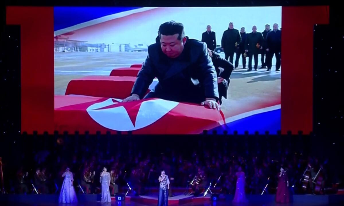 조선중앙TV는 30일 북러 간 '포괄적 전략적 동반자 관계 조약' 체결 1주년에 즈음해 전날 동평양대극장에서 열린 북러 예술인 공연 중 북한 가수의 무대 배경으로 김정은 국무위원장이 관을 인공기로 덮는 듯한 사진이 사용됐다.