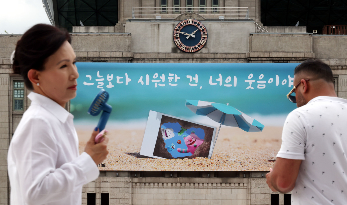 전국에서 무더위가 기승을 부리고 있는 30일 서울 중구 서울도서관 외벽의 대형 글판인 서울꿈새김판에 ‘그늘보다 시원한 건, 너의 웃음이야’라는 문구의 여름판이 새로 꾸며져 있다.