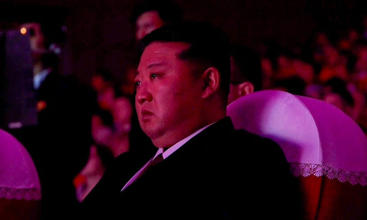 지난 29일 동평양대극장에서 열린 예술인 공연 중 무대 배경화면에 러시아 파병 북한 군인들의 활동 모습이 상영되자 김정은 국무위원장이 눈물을 글썽이고 있다. 조선중앙TV 연합뉴스