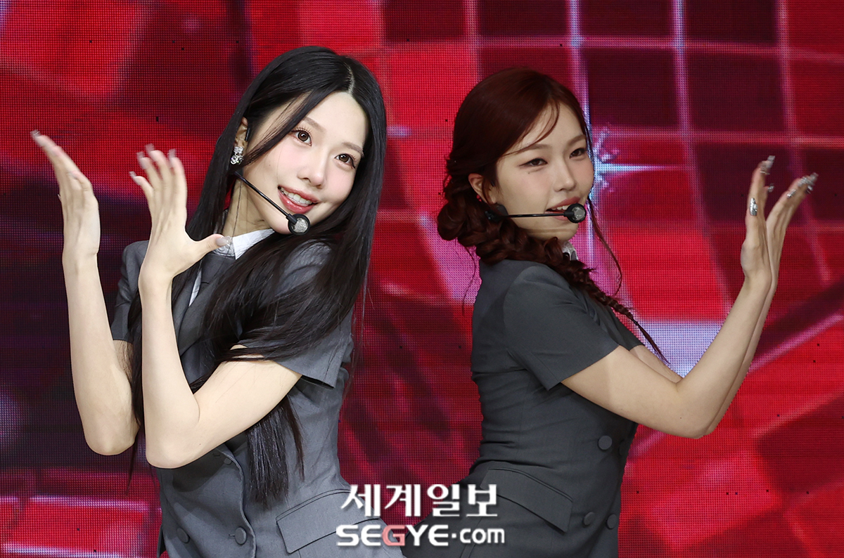 그룹 블링원 클로이(사진 왼쪽)와 엘리가 2일 서울 중구 장충동 크레스트72에서 열린 세 번째 싱글 앨범 ’미스터’ 쇼케이스에 참석해 열띤 공연을 펼치고 있다.