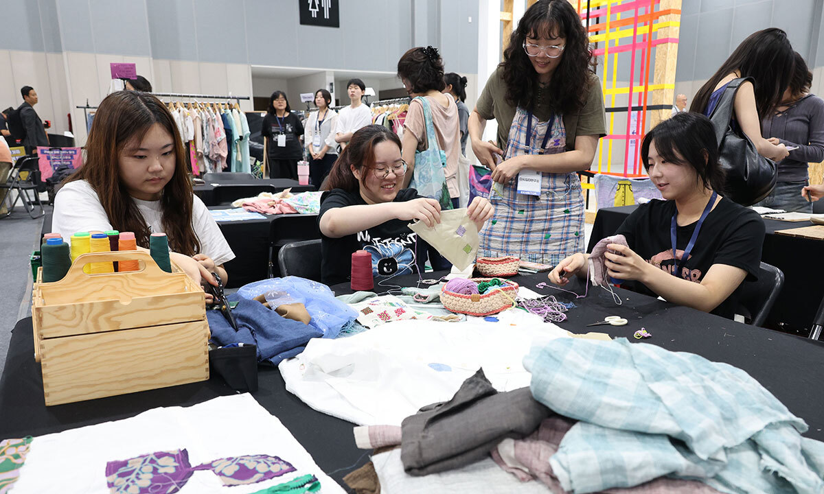2일 서울 강서구 코엑스마곡 컨벤션센터에서 개막한 ‘2025 대한민국 순환경제 페스티벌’에서 관람객들이 ‘다시입다연구소’ 부스에서 옷 수선을 하고 있다. 산업통상자원부는 4일까지 이곳에서 228개 기업·기관의 순환경제 관련 혁신 기술·제품을 전시한다.
