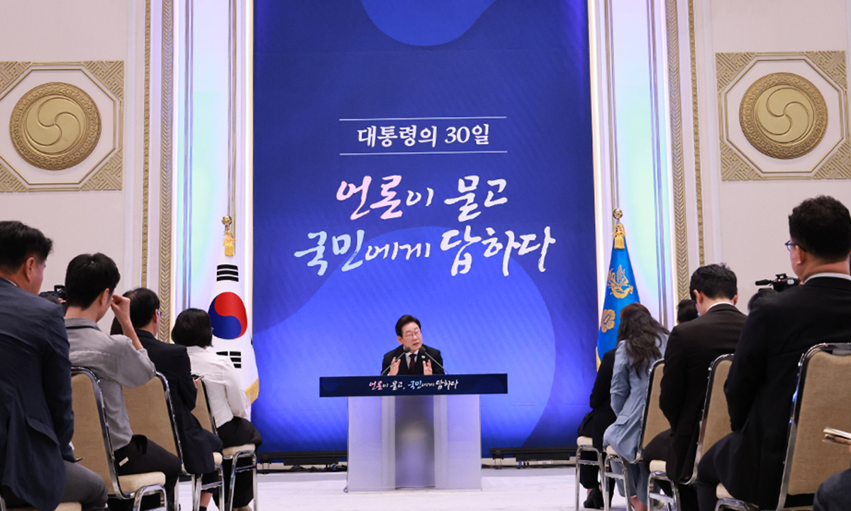 이 대통령은 이날 취임 한 달을 맞아 청와대 영빈관에서 진행한 '대통령의 30일, 언론이 묻고 국민에게 답하다'라는 제목의 기자회견에서 "한일 사이는 예민한 의제들이 많지만, 일전에 말씀드린 것처럼 양국은 가깝고도 먼 나라이자 앞마당을 같이 쓰는 이웃"이라며 이같이 밝혔다.