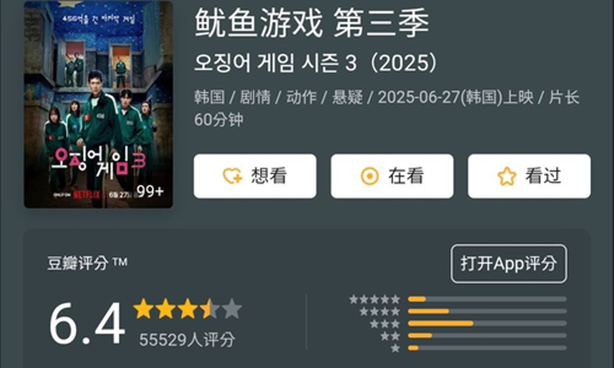 중국 최대 리뷰 사이트 '더우반'(Douban)에는 지난달 27일 공개된 '오징어게임3' 관련 리뷰가 지난 3일 기준 2만1천여 건 등록된 것으로 나타났다. 별점 평가에는 5만5천여 명이 참여한 것으로 집계됐다.