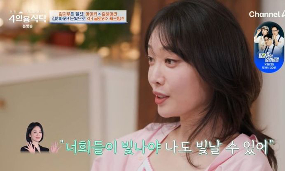 김히어라는 "'더 글로리' 주요 배우 간의 사전 리딩을 하는데, 혜교 언니가 '이번에 잘 하고 싶다. 많이 도와 달라. 이 드라마는 너네 드라마다. 너희가 잘해야 내가 산다. 너네 하고 싶은 대로 다 해'라고 했다"고 설명했다.